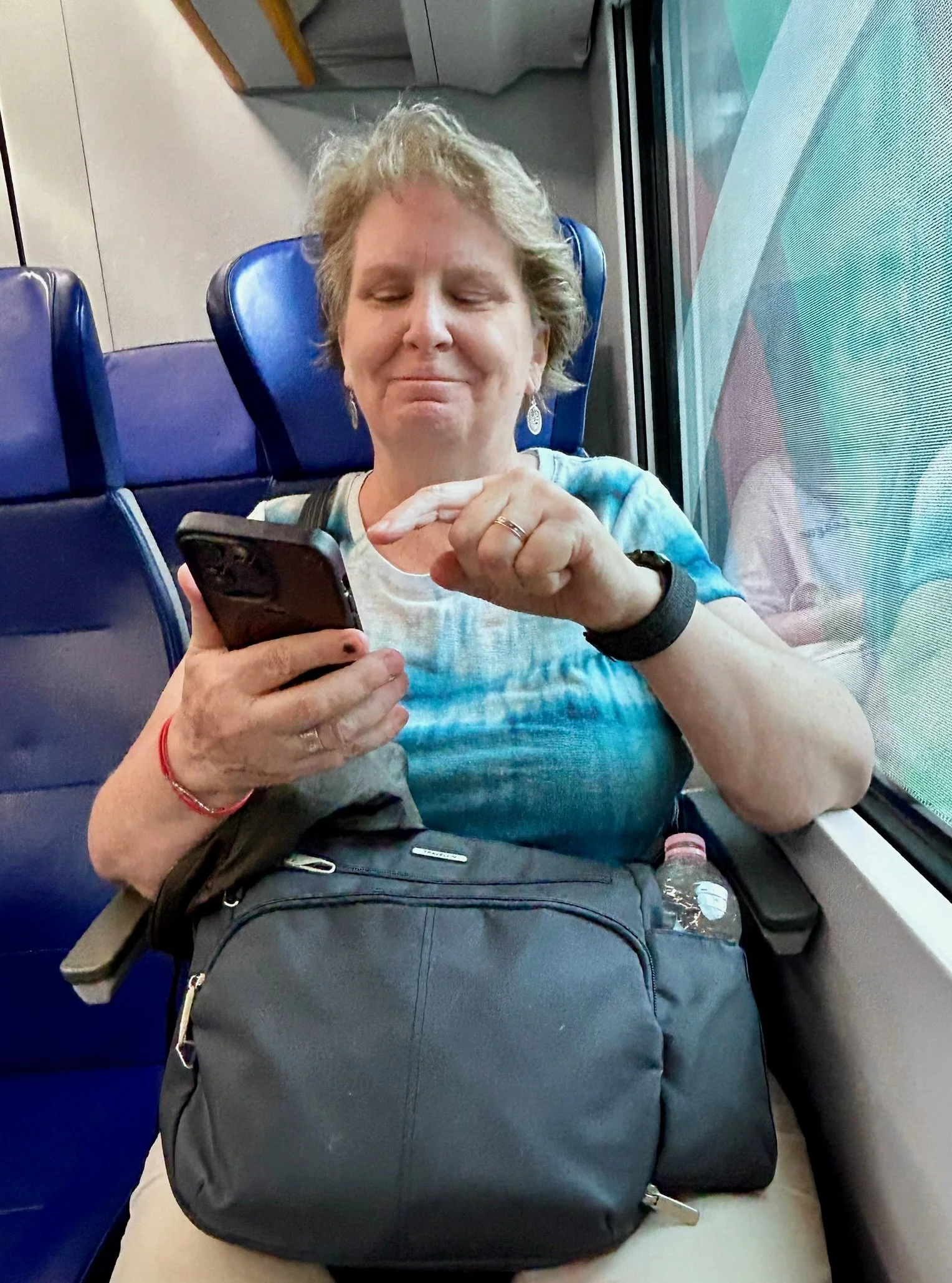 Sue using her iPhone to figure out direction to the hotel after we get off the train.